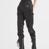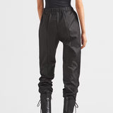 A hybrid design that combines characteristic elements of joggers like an elasticized waist with the technical allure of Re-Nylon Gabardine fabric: the regenerated nylon fabric that is emblematic of the brand and produced from recycled plastic trash recovered in the ocean. For the Fall Winter collection 2020, traditional materials are combined with technologically innovative recycled fibers. The triangle logo decorates the front. For sustainable care to preserve the product's characteristics and reduce microfiber shedding, we recommend not washing the item too often. Let the product air out after every use and have it dry cleaned at a specialized ecological dry cleaners. Product code: 22H844_1WQ8_F0002_S_211 Re-Nylon Gabardine Straight fit Unlined Side closure Elasticized waistband with drawstring Inset pockets on the side seams Elasticized hem Enameled metal triangle logo The model is 180 cm tall and wears a size 38 Height: 100cm