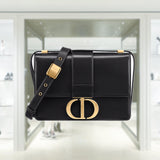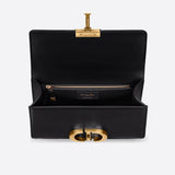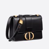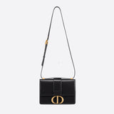 The 30 Montaigne line is inspired by the emblematic address and offers essential pieces that embody the House's iconic codes. The handbag is crafted in box calfskin for an elegant and modern look. The flap is embellished with an antique gold-finish metal CD clasp, inspired by the seal of a Christian Dior perfume bottle. Refined details, such as an embossed 30 MONTAIGNE signature on the back, define this unique design. Featuring an adjustable leather shoulder strap, the bag may be carried by hand, worn over the shoulder or crossbody.