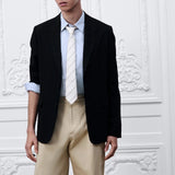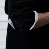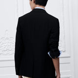 Crafted from black virgin wool, it features timeless fit finished with sharp notch lapels and side flap pockets.