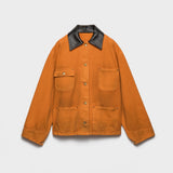 The casual aesthetic is defined by contrasting leather collar and multiple patch pockets, finished with the iconic leather triangle logo—reimagined here with sharp, conceptual edge.