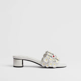 By blending sleek, modern silhouette with striking mirrored heel, these slides offer fresh take on contemporary elegance.