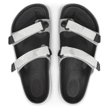 The BIRKENSTOCK Sahara is a variation on the classic Arizona and is the perfect sandal for anyone who is on their feet all day. The pin buckles have been replaced by hook-and-loop fasteners and the heel of the sole has been reinforced. Perfect for all active and adventurous BIRKENSTOCK fans. The polyurethane sole is affixed to the footbed in two layers and therefore offers maximum flexibility, grip and durability. The upper is made from the skin-friendly, hard-wearing synthetic material Birko-Flor which was reinterpreted with a futuristic look. Anatomically shaped cork-latex footbed Upper: Birko-Flor Futura Footbed lining: polyurethane (PU) Sole: light polyurethane sole (PU) Details: two straps, each with an individually adjustable hook-and-loop fastener Made in Germany