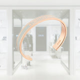 This Dior Code bangle impresses with its modern, attractive makeup. The stiff metal accessory with rose gold finish features the Christian Dior lettering on pale blue lacquer. Combine the elegant bangle with other Dior Code creations.