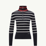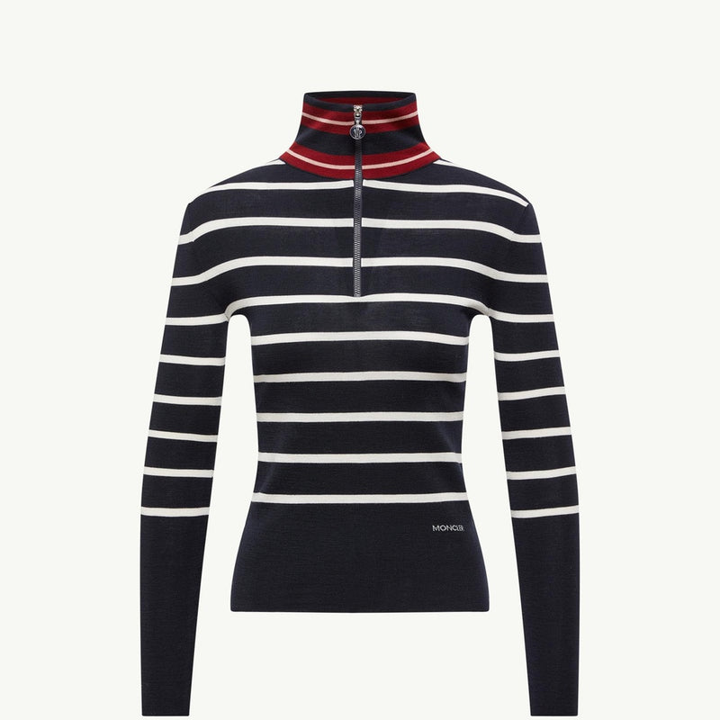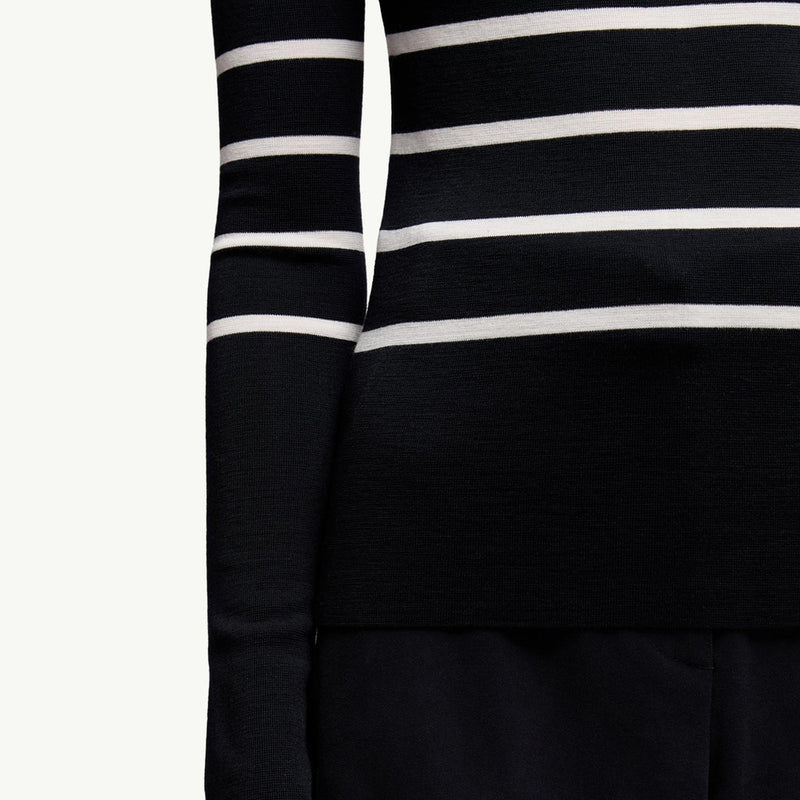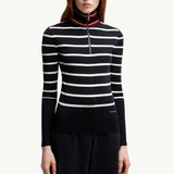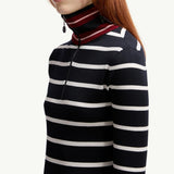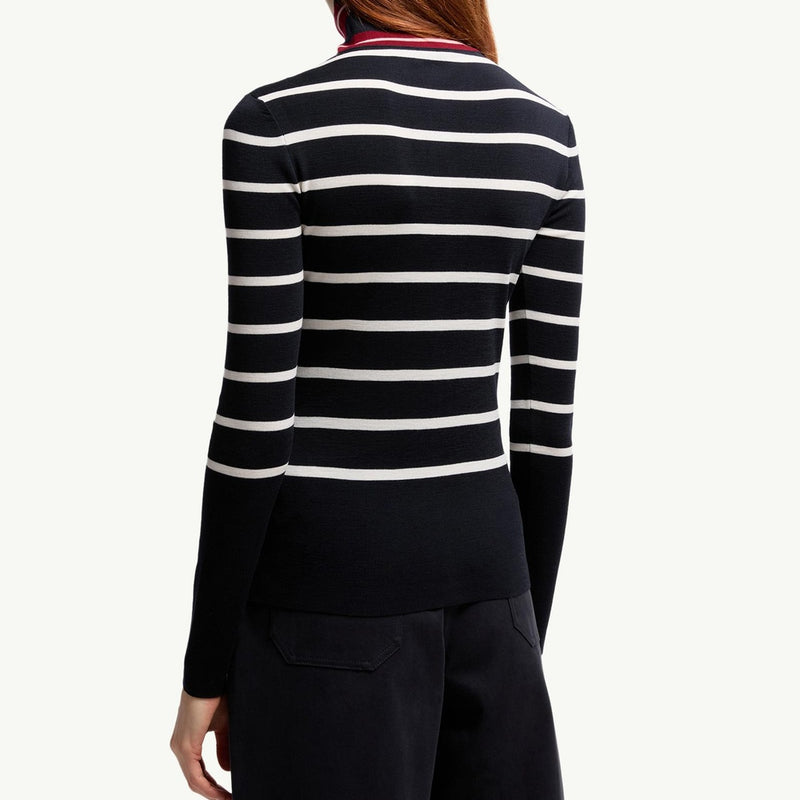 This refined polo neck jumper showcases a classic horizontal stripe pattern in timeless blue and white, offering versatile styling for any casual or smart-casual occasion. Crafted from soft, insulating wool, it provides superior warmth without compromising on a lightweight feel. Its sophisticated silhouette makes it an effortless layering piece for the cooler seasons.