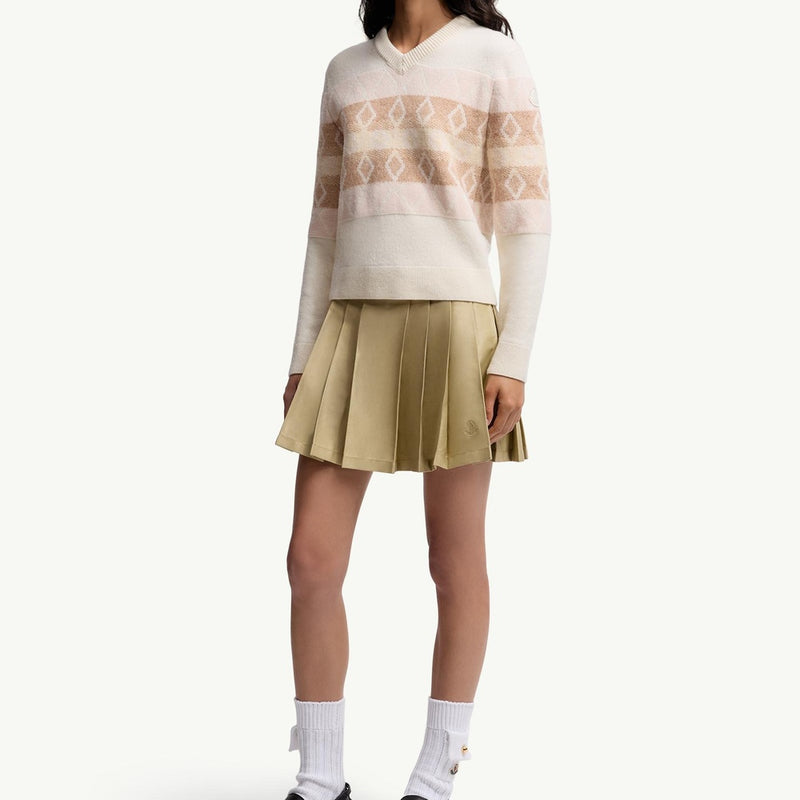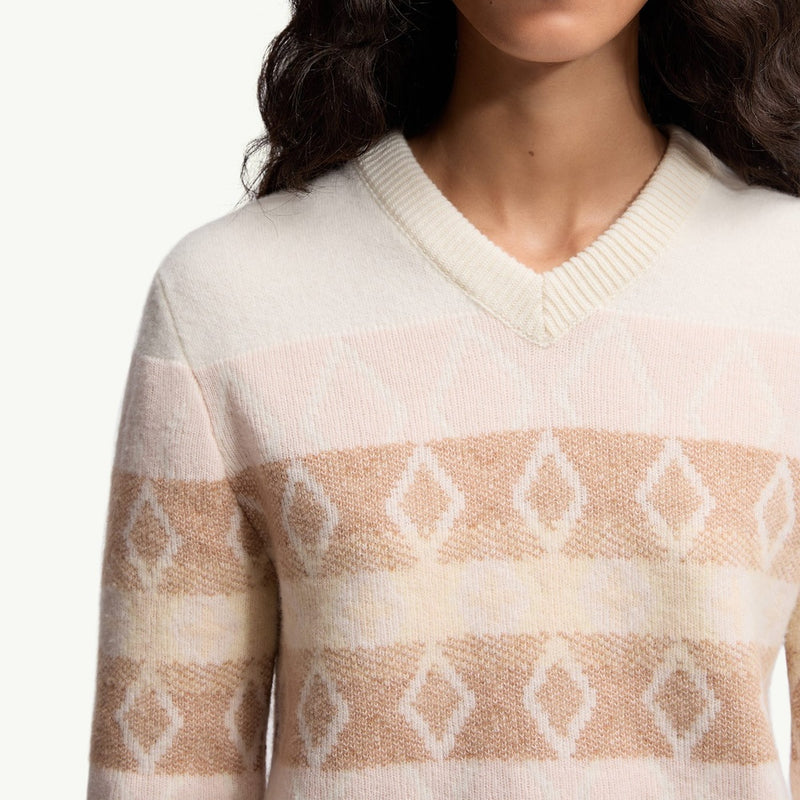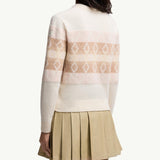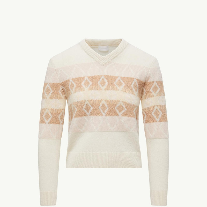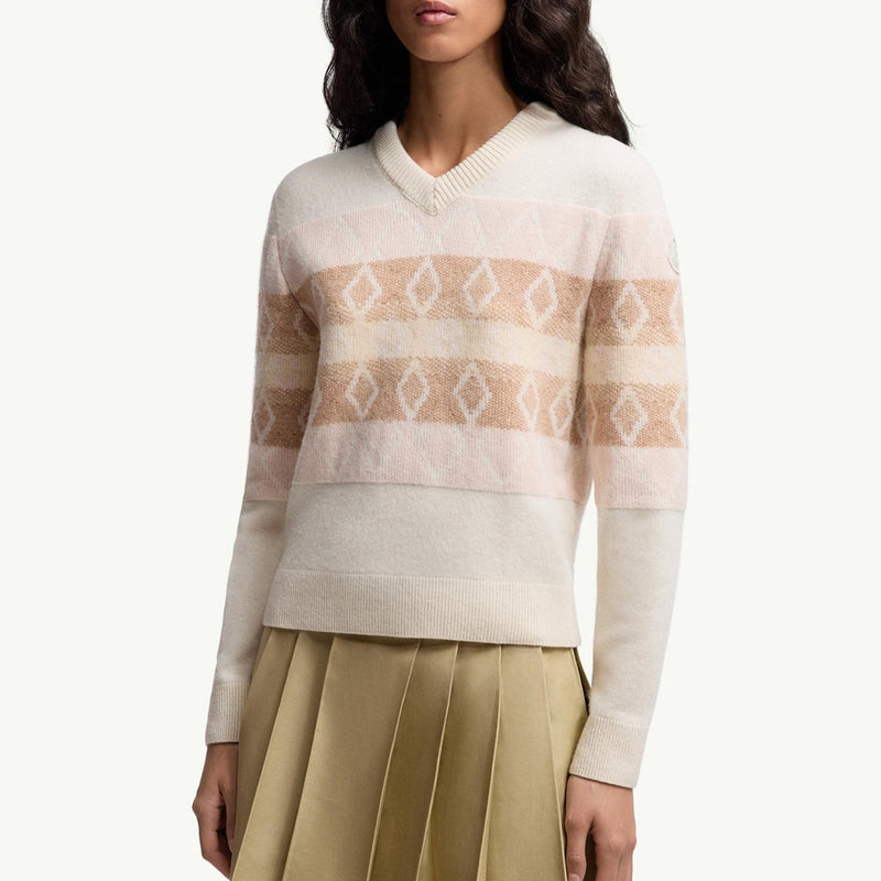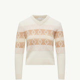This V-neck sweater is crafted from a luxurious wool jacquard fabric, offering exceptional warmth and a sophisticated texture. The striking white and pink design creates a modern, eye-catching aesthetic perfect for elevating everyday outfits. Enjoy the relaxed fit and soft hand feel that make this piece an indispensable addition to your cool-weather wardrobe.