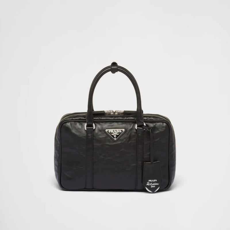 This bag with casual, classic allure is made of glossy nappa leather with a natural finish. The handmade wrinkled effect contrasts with the concept of a rigid construction, reinterpreting an everyday object that can be worn without constraints. Presented for the Spring Summer 2023 collection, the accessory that is a re-edition of a bag presented in 2001 is decorated with the enameled metal triangle logo.