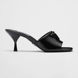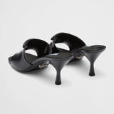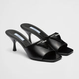 The iconic triangle comes in new versions as on these mid-heeled slides, where it is transformed into a slightly padded leather detail and is accented by the screen-printed Prada logo. Brushed leather, traditionally used for classic fine footwear, has been reinterpreted in Prada collections since the '90s on unexpected designs for a hybrid result that reflects the duality of the brand.Leather Product code:1XX590_055_F0002_F_065