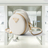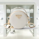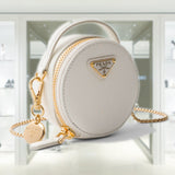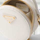 This round mini-pouch has a modern and sophisticated silhouette that is emphasized by the unmistakable crosshatch texture and wax finish of Saffiano leather, a distinctive material of Prada collections. The accessory brightened by the metal hardware has an elegant removable chain shoulder strap, while the enameled metal triangle logo completes the style with its distinctive, iconic signature.