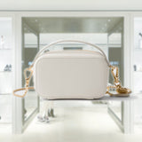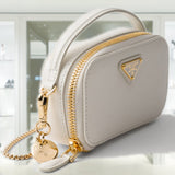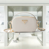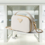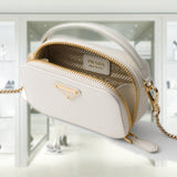 This refined, sleek mini-pouch is enriched by the unmistakable crosshatch pattern with waxed finish of Saffiano leather, a distinctive material of Prada collections. The accessory with leather handle and removable chain shoulder strap is decorated with the iconic enameled metal triangle logo.