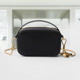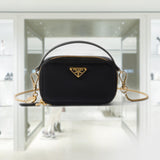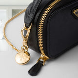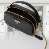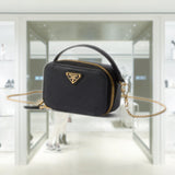 This refined, sleek mini-pouch is enriched by the unmistakable crosshatch pattern with waxed finish of Saffiano leather, a distinctive material of Prada collections. The accessory with leather handle and removable chain shoulder strap is decorated with the iconic enameled metal triangle logo.