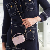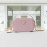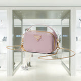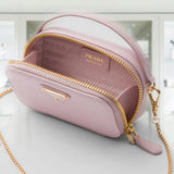 This refined, sleek mini-pouch is enriched by the unmistakable crosshatch pattern with waxed finish of Saffiano leather, a distinctive material of Prada collections. The accessory with leather handle and removable chain shoulder strap is decorated with the iconic enameled metal triangle logo.