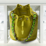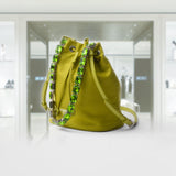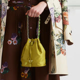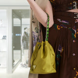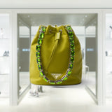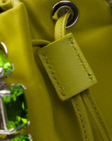 This mini-bag inspired by an archive design features a bucket bag silhouette and is made of Re-Nylon, the innovative regenerated nylon yarn that is an evolution of Prada's iconic fabric. The refined accessory, which can be carried by hand or worn with the removable shoulder strap, is enriched with an elegant jeweled handle.