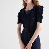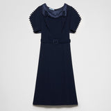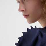 The light, feminine silhouette is enriched by triangle trim that runs along the sleeves and neckline, enriching the design with distinctive, sophisticated allure.