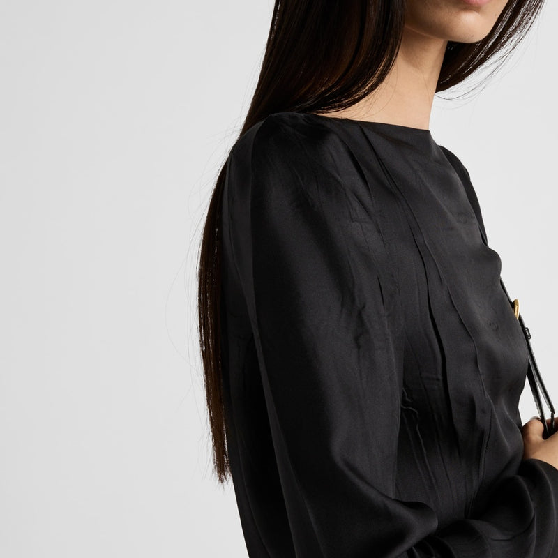 This silk twill dress, an emblem of pragmatic elegance, features sophisticated silhouette and plunging back.